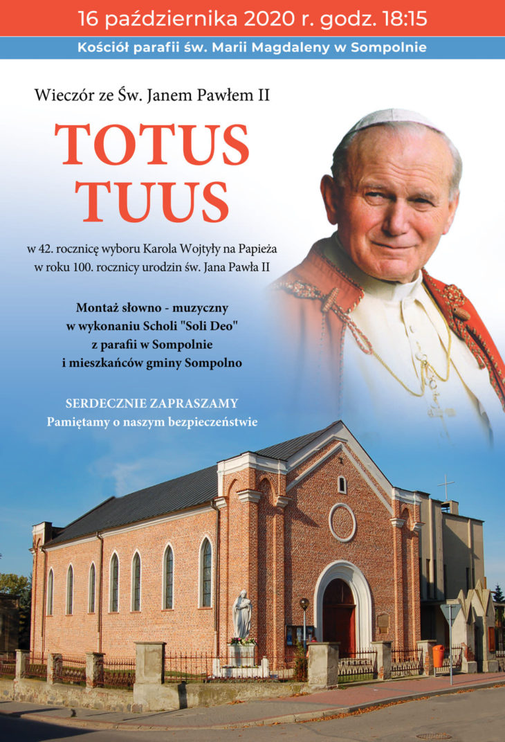 Montaż słowno-muzyczny w wykonaniu scholii “Soli Deo” z naszej parafii oraz mieszkańców gminy Sompolno. Serdecznie zapraszamy 16 października br. o godz. 18.15.