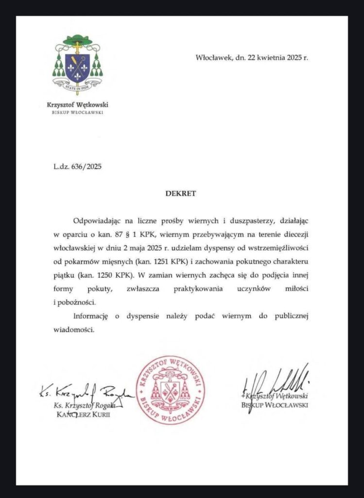 Dyspensa od pokarmów mięsnych w piątek 2 maja 2025