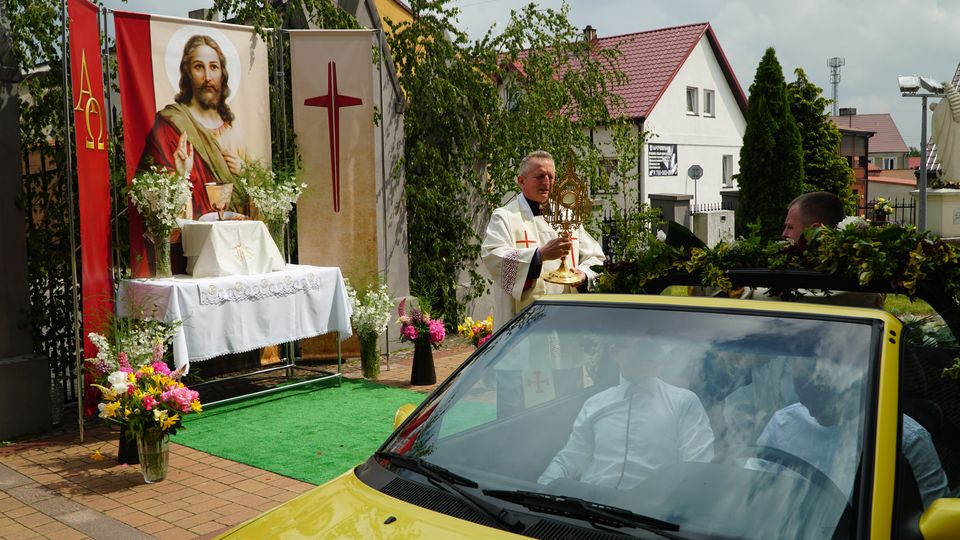 Uroczystość Najświętszego Ciała i Krwi Chrystusa w roku pandemii koronawirus przypadła w dniu 11 czerwca. W Sompoleńskiej Parafii pw. Świętej Marii Magdaleny miała charakter bardzo wyjątkowy! Przy zachowaniu obostrzeń epidemicznych i zaleceń ks. biskupa procesja po mszy świętej z godziny 11:30 celebrowanej przez proboszcza ks. kanonika Mirosława Lamenta przeszła dookoła kościoła. Wierni w skupieniu oraz utwierdzeni, słowami z homilii, że „Bóg jest w każdym z nas-tworząc mistyczne Ciało Chrystusa ” prosili pana o dalsze łaski a zwłaszcza o dar żywej wiary. Trudny czas wyzwala w duszpasterzach nowe formy zbliżenia z parafianami! Od godziny 14:30 po przekazaniu Najświętszego Sakramentu z rąk ks. Kanonika do Ks. Wikariusza Pan Jezus odkrytym samochodem odwiedził wszystkie ulice Sompolna oraz wiele wiosek Parafii. Wielu Wiernych w sposób wzruszający: śpiewem, pokłonem i pozdrowieniem uczcili wyjątkowe odwiedziny tym samym otwierając się jeszcze bardziej na miłość Zbawcy.